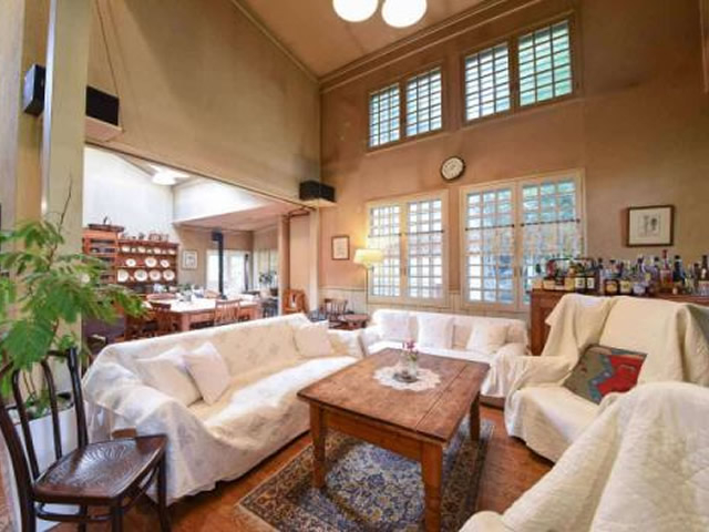 ラウンジは暖炉のある吹き抜けになっており、アンティークのテーブル・椅子・飾り棚など、