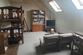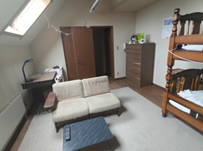 部屋は約8畳でTV、冷蔵庫、2段ベッド、暖房、机あり。