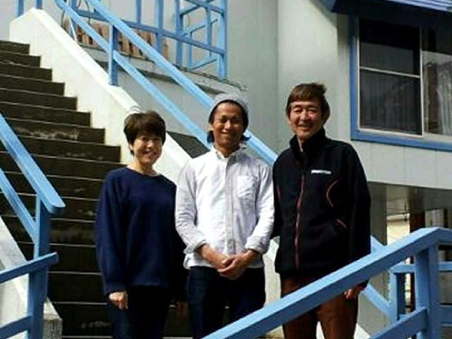 【ある年のスタッフ君(中)とオーナー夫妻(両脇)】ペンションならでは★アットホームな職場です(*^^)v ペンション最寄りの越後湯沢駅はカフェやレストラン、温泉にお土産など…余暇を過ごすにはオススメ♪